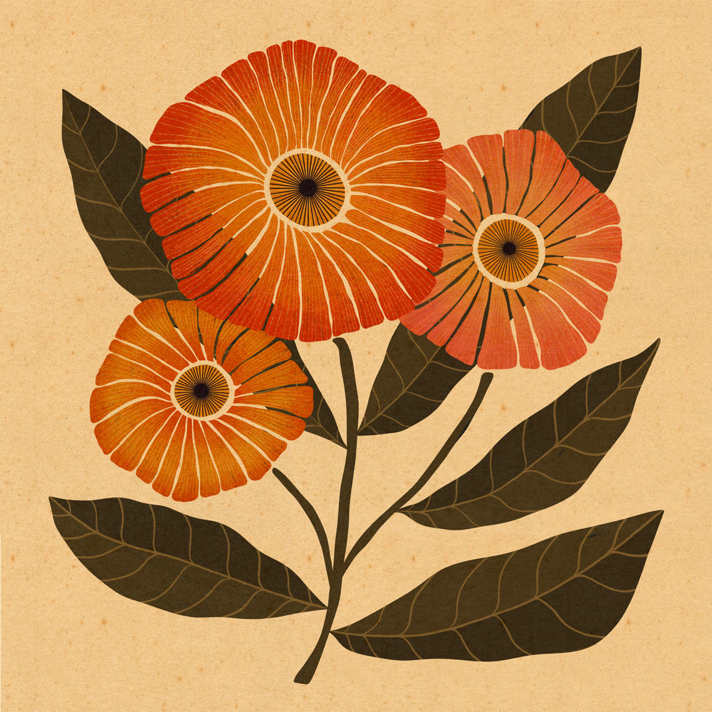 Named after Bonnie Parker of Bonnie and Clyde, Bonnie is an illustration that embodies defiance, charm, and untamed beauty. The striking blooms radiate confidence, their vivid petals fanning outward like a burst of momentum, while deep green leaves ground them with quiet strength. Inspired by a woman who lived unapologetically on her own terms, this piece is a celebration of resilience and daring spirit. Printed on archival-quality paper with rich, lasting inks, Bonnie is a statement of boldness, passion, and the beauty of living fiercely.