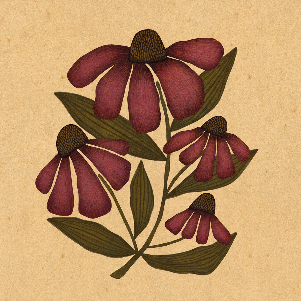 Doris, a tribute to the legendary drag queen, artist, and performer Doris Fish, this floral illustration captures both elegance and edge. With deep plum petals and rich olive leaves set against a warm, textured background, Doris blends botanical beauty with theatrical flair.