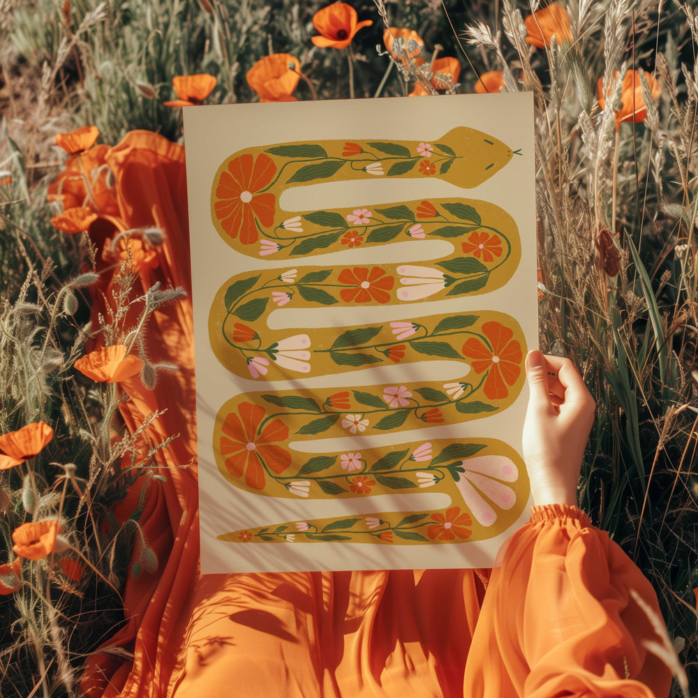 Die Gartenschlange windet sich anmutig durch ein Gewirr aus Blüten und Ranken und verkörpert die stille Magie verborgener Winkel der Natur. Inspiriert von blühenden Gärten, in denen Wildblumen wuchern und das Leben unter der Oberfläche summt, vereint diese Illustration Bewegung, Stille, Wachstum und Erneuerung. Gedruckt auf archivarischem Papier mit hochpigmentierten Tinten, feiert die Gartenschlange die stille, ungezähmte Schönheit der Natur.