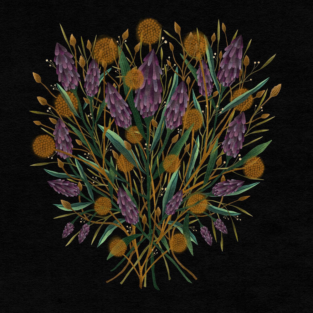 Lucy Jane , benannt nach meiner Nichte, ist eine Hommage an Individualität, Stärke und die Schönheit, einzigartig zu sein. Wie ihr Namensgeber ist diese Illustration voller Tiefe und Charakter – goldene Blüten und zartviolette Blumen verflechten sich zu einer komplexen, organischen Komposition vor einem satten schwarzen Hintergrund, der jedes Detail zum Leuchten bringt. Die Balance aus zarten und kräftigen Elementen spiegelt die Einzigartigkeit von Lucy Jane selbst wider, einer Person, deren Präsenz warm und unvergesslich zugleich ist. Gedruckt auf archivarischem Papier mit langlebigen, leuchtenden Tinten, ist Lucy Jane ein atemberaubendes Werk, das den Geist der Originalität und die Verbundenheit, die wir schätzen, würdigt.
