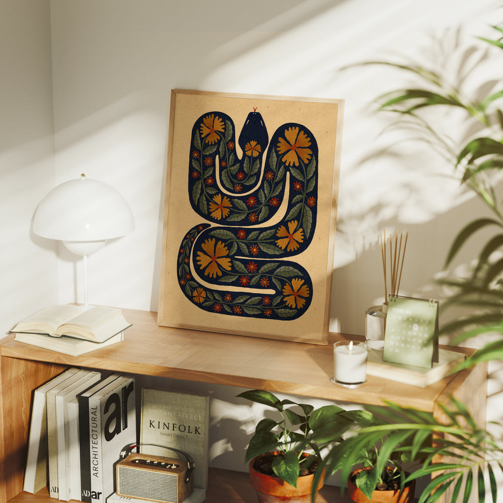 Meadow Serpent verbindet die Dualität von Stärke und Sanftheit und verkörpert den natürlichen Rhythmus der Transformation. Inspiriert von wilden Wiesen in voller Blüte verbindet diese Illustration die gewundene Form einer Schlange mit einem blühenden Wandteppich aus goldenen Blütenblättern, tiefgrünen Blättern und feuerroten Blüten. Die Schlange – ein uraltes Symbol für Erneuerung und Widerstandsfähigkeit – bewegt sich mit stiller Zuversicht, verwoben mit der Schönheit der ungezähmten Natur. Gedruckt auf archivarischem Papier mit satten, langlebigen Tinten, ist Meadow Serpent ein kraftvolles und zugleich harmonisches Werk, das die Verbindung zwischen Leben, Wachstum und dem Land, das uns erhält, würdigt.