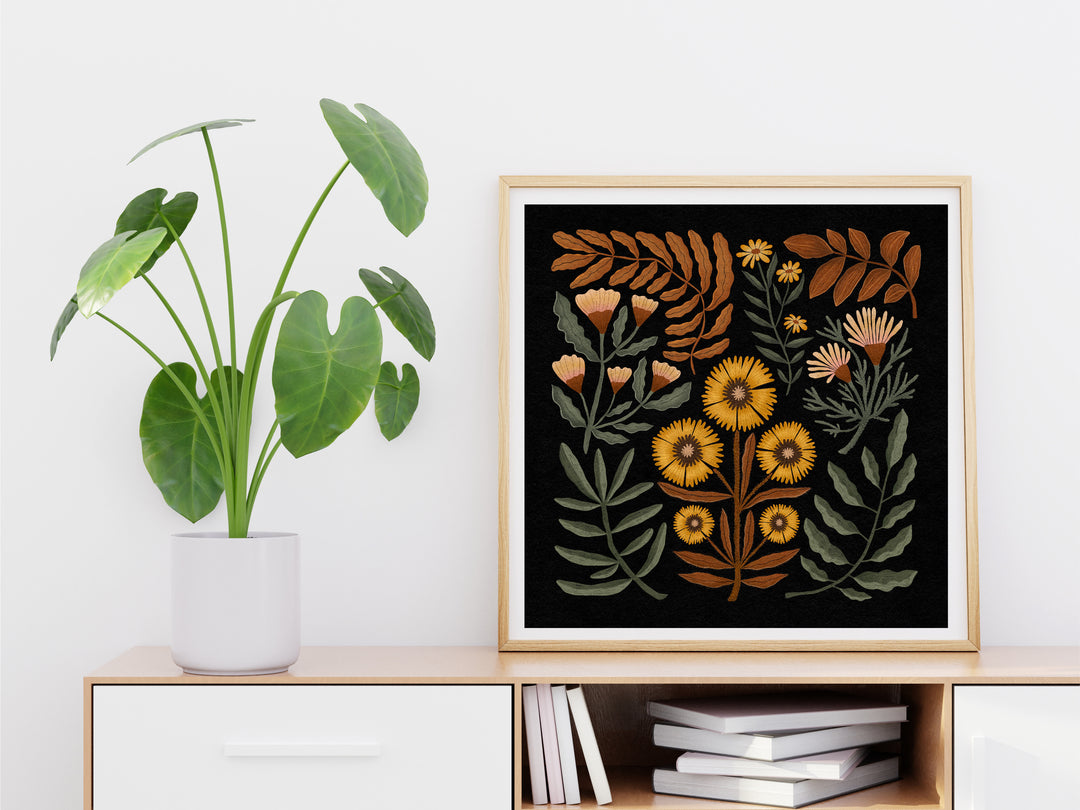 All artworks are created digitally and printed on matte, archival paper. Some of the artworks have a "textured paper" look which is printed onto the paper.