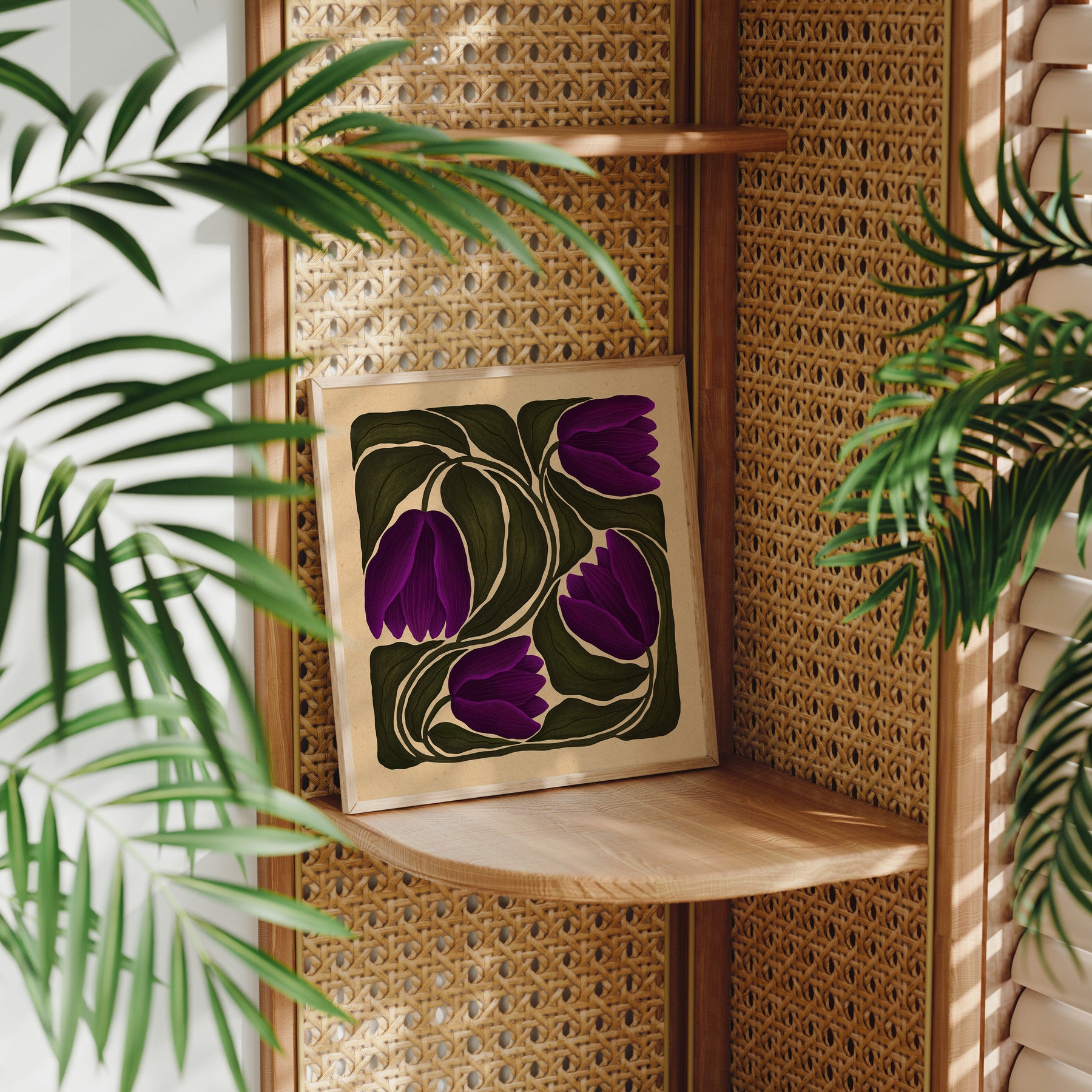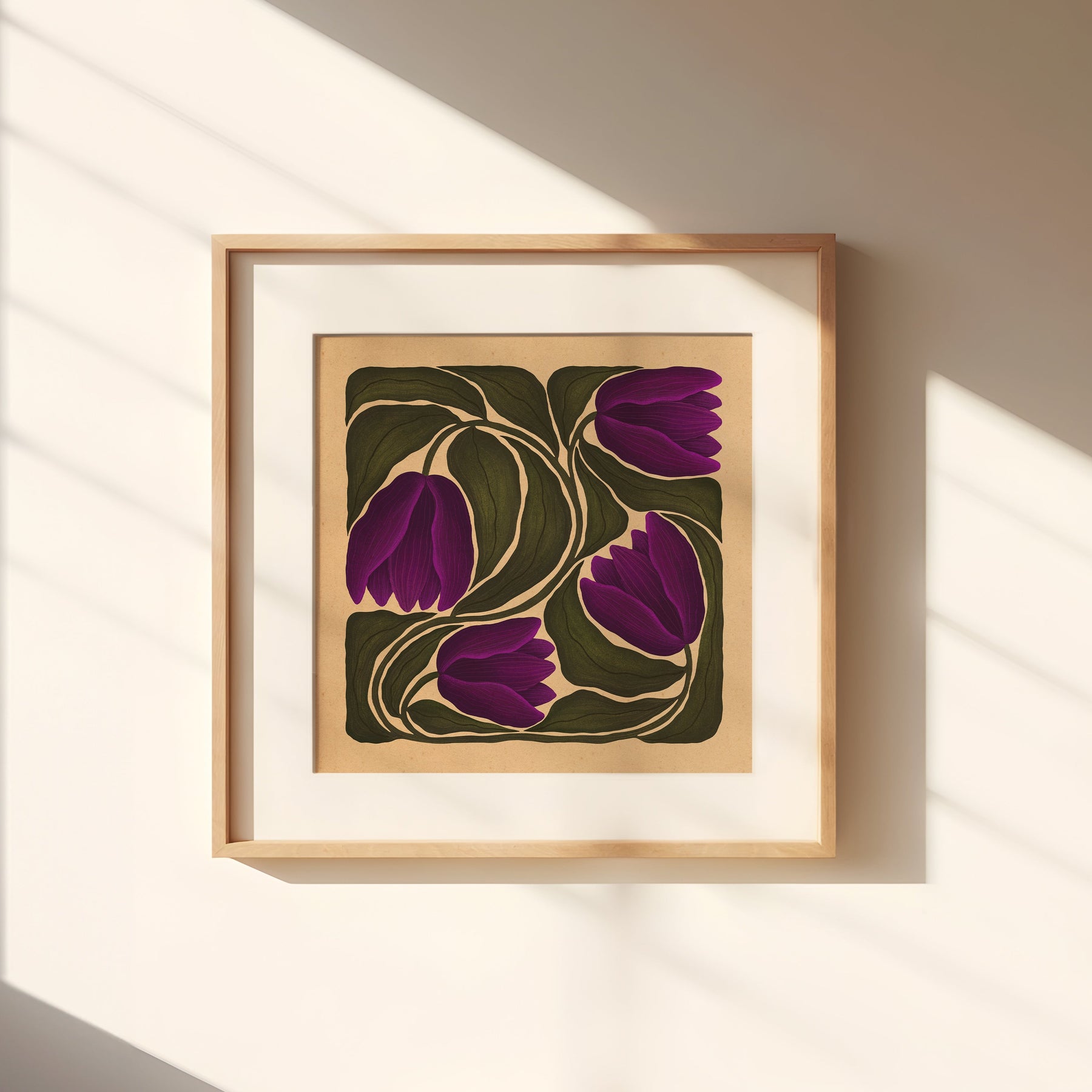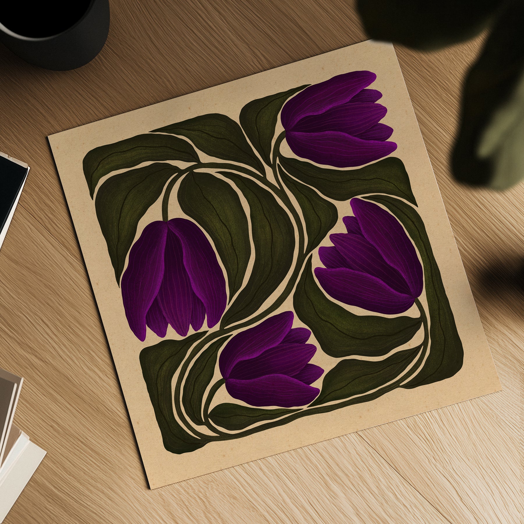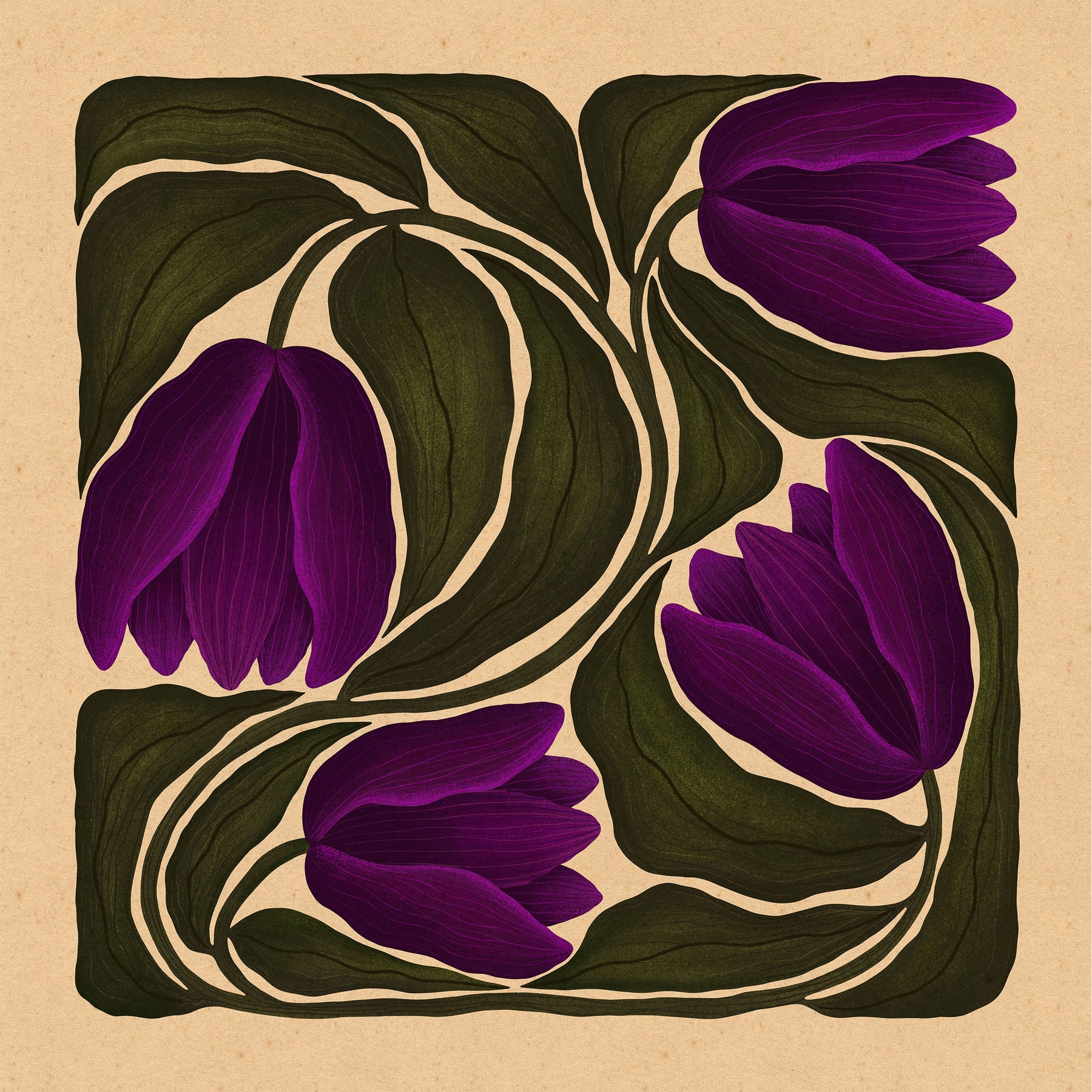 Named after Alexandria Ocasio-Cortez, Alexandria is a celebration of resilience, courage, and clarity. Inspired by the boldness of truth and the power of speaking up, this botanical illustration features deep, moody purples entwined with rich green foliage set against a warm, grounded background. The flowing forms and organic movement reflect strength and grace; an homage to those who stand firm in their convictions. Printed on archival-quality paper with vibrant, lasting inks, Alexandria brings both beauty and purpose to any space.