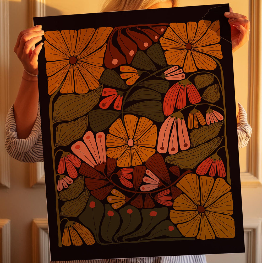 Faye is a striking floral composition inspired by the allure and unapologetic spirit of Faye Dunaway; an icon of intelligence, style, and effortless rebellion. With deep golden tones, rich siennas, and soft blush hues, this piece channels the cinematic drama and razor-sharp elegance that defined Dunaway’s presence. Much like the actress herself, Faye refuses to be merely pleasing; it is bold, complex, and utterly captivating. A tribute to a woman who knew how to wear a hat like armor, this illustration embodies strength, sophistication, and a touch of vintage glamour. Printed on archival-quality paper with lasting, vibrant inks, it’s a statement piece for those who appreciate beauty with an edge.