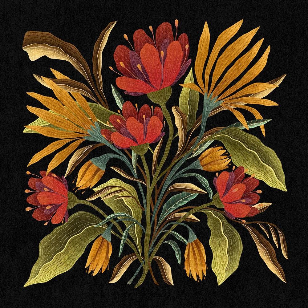 Garden Bouquet is a celebration of untamed beauty, a wild gathering of blooms that feels both organic and intentional. Inspired by the natural movement of a garden left to flourish, this piece captures the richness of deep red florals, golden petals, and lush green leaves against a dark backdrop. The layered textures and intricate details give the composition a sense of depth, as if the bouquet is unfolding in real time. Printed on archival-quality paper with lasting, vibrant inks, this illustration brings the warmth and vibrancy of a flourishing garden into any space.